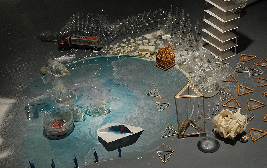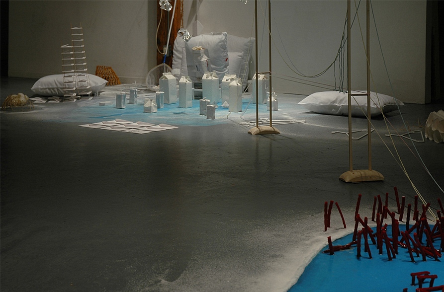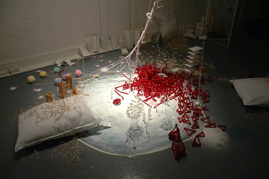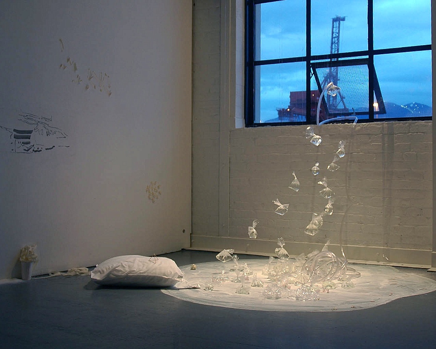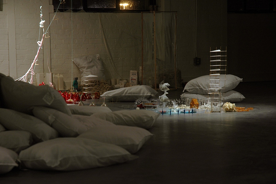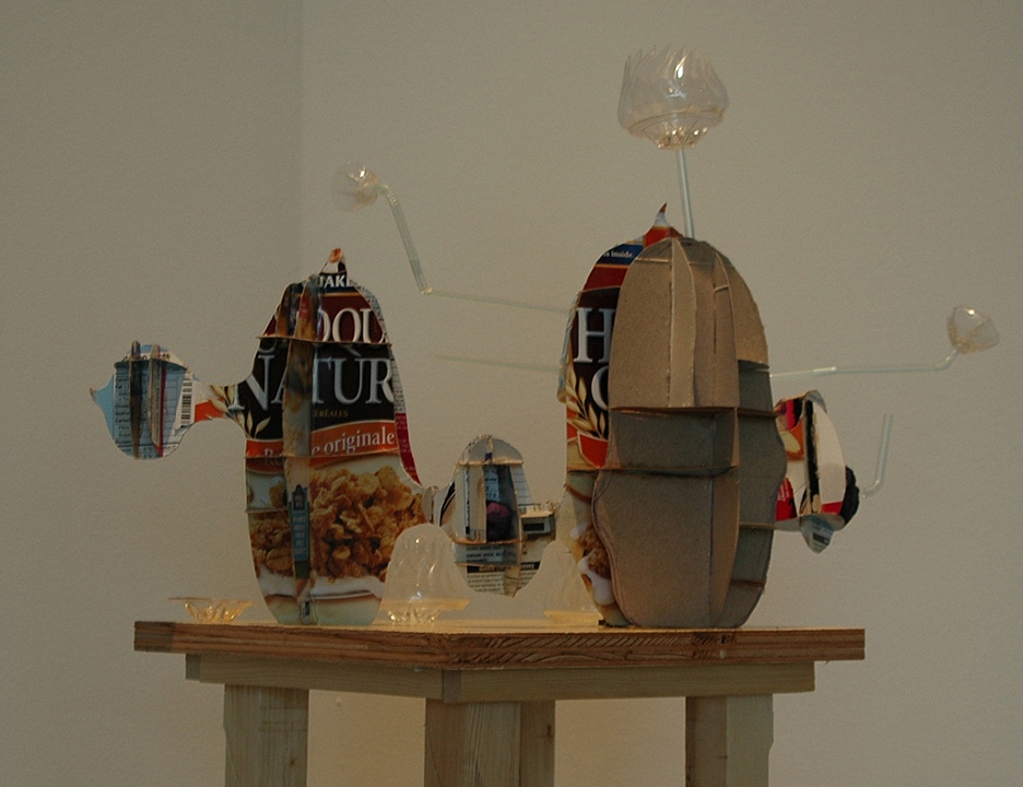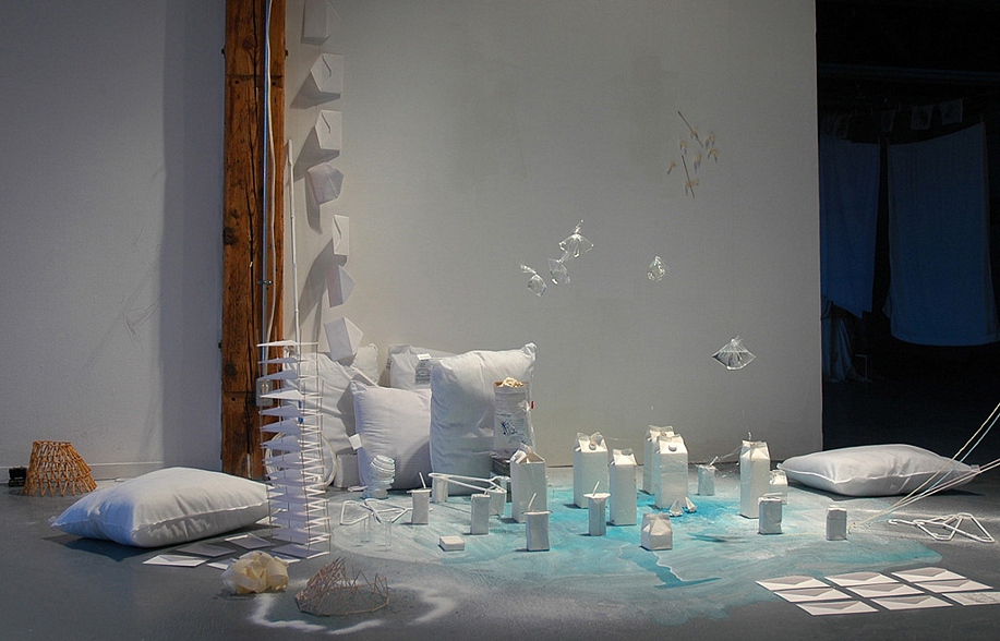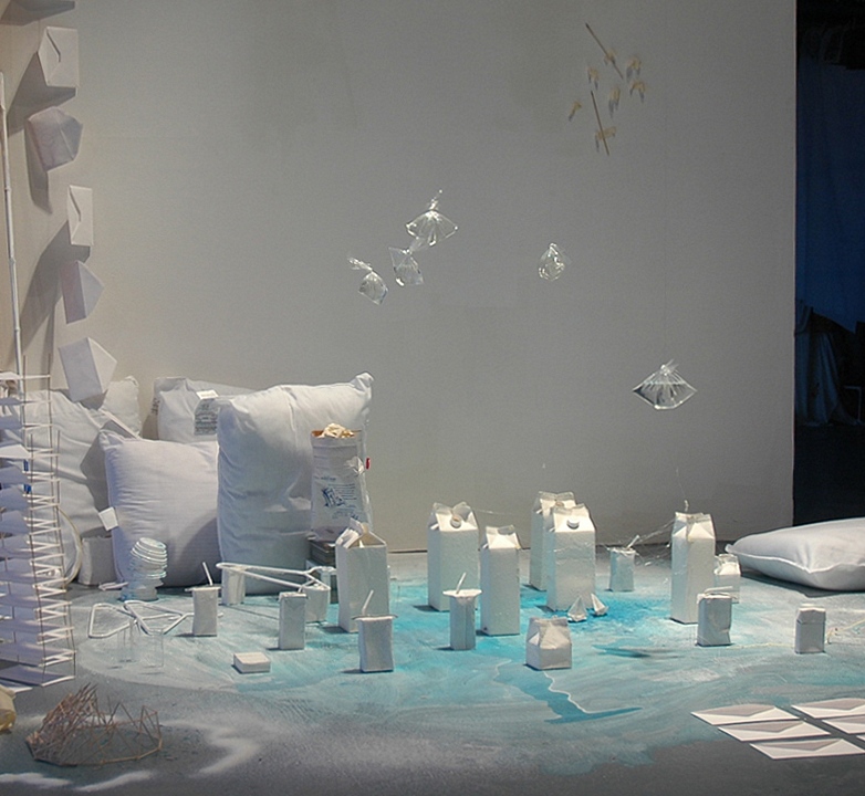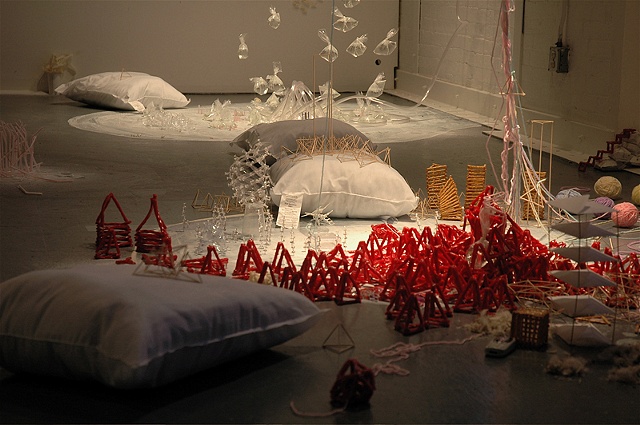 Pillows, jell-o, liquorice, sandwich bags, water, sugar, shampoo, pretzels, envelopes, pins, coffee cups, milk cartons, feathers, yarn and other mixed media