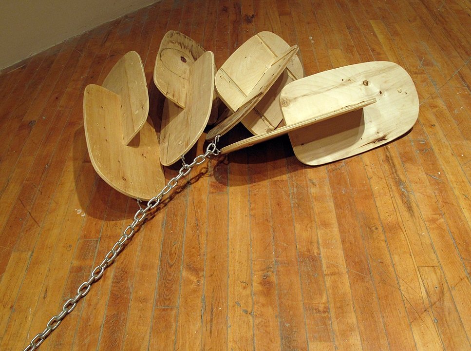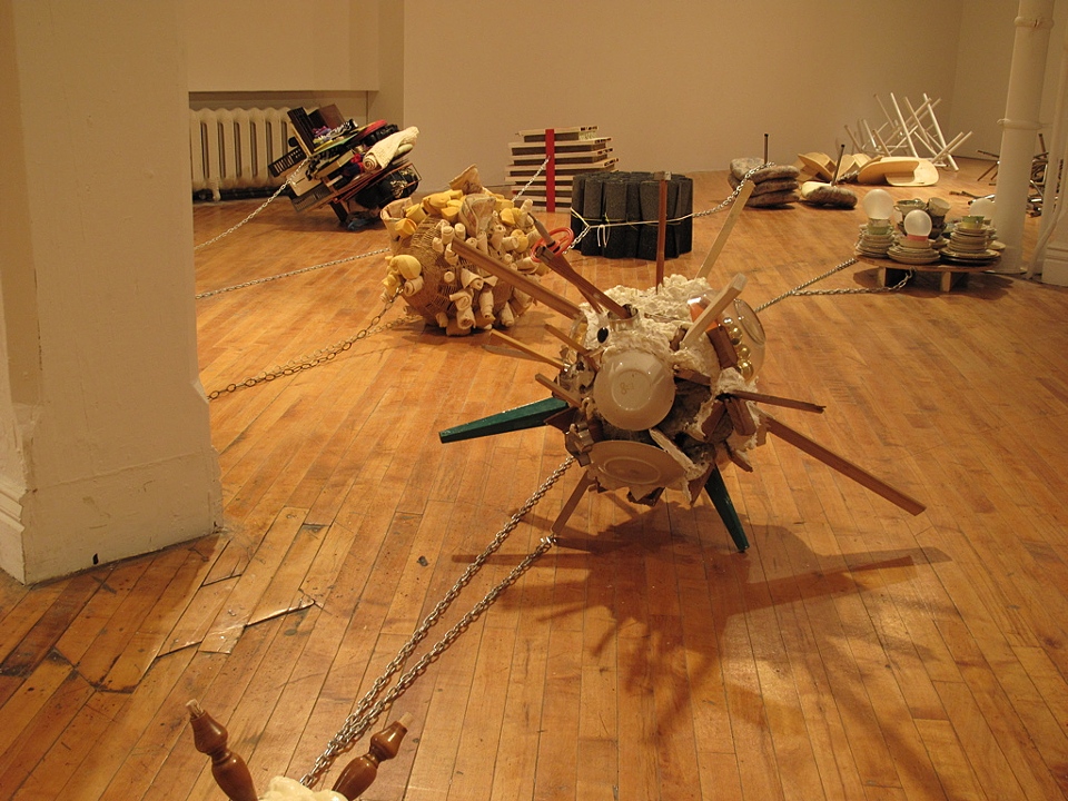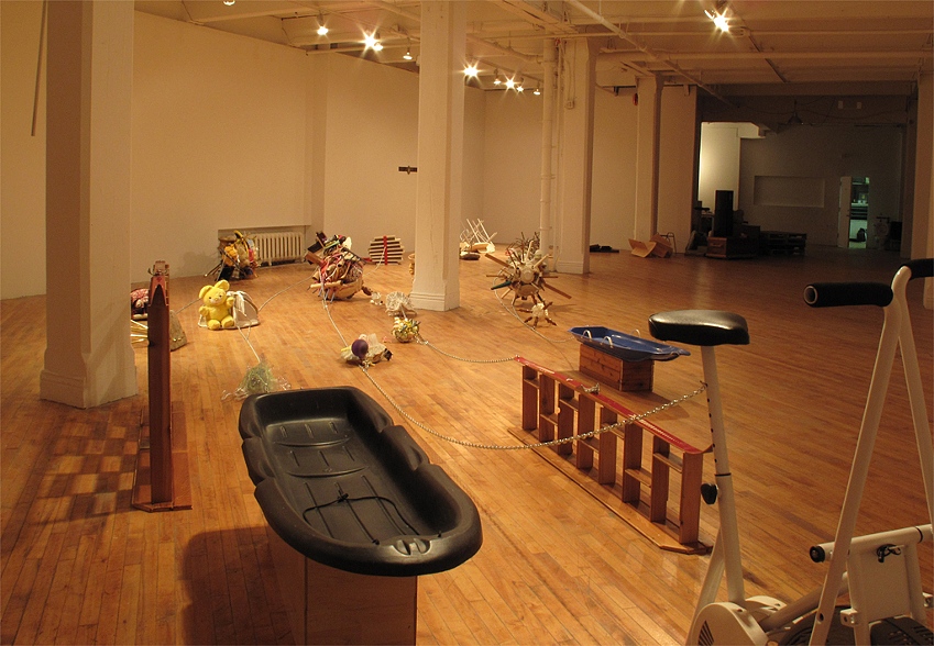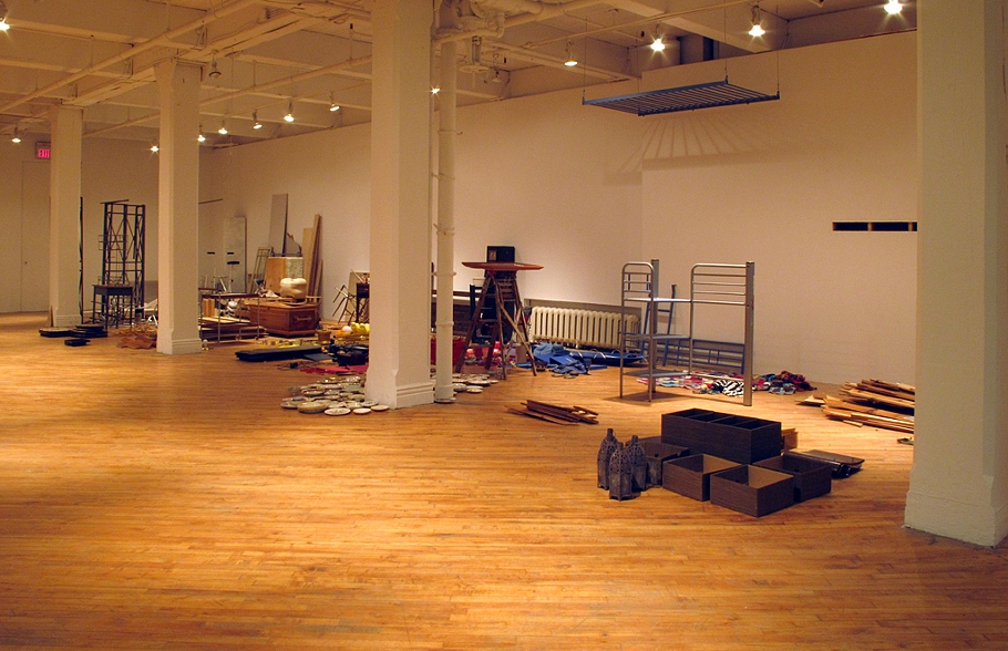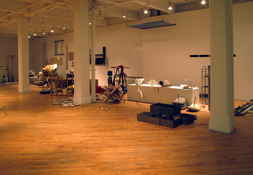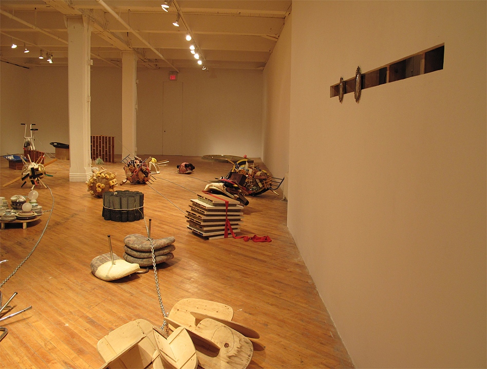 A one-ton shipment of unwanted household items, sporting equipment, furniture, and building supplies arrived at the gallery on the first day of the show. These materials had been collected for me by a local junk removal company. Each night of the exhibition, I worked the “night shift” – rearranging and reworking the items until they settled into a “final” arrangement. At the end of the exhibition, the materials were given away or taken back by the junk removal company.