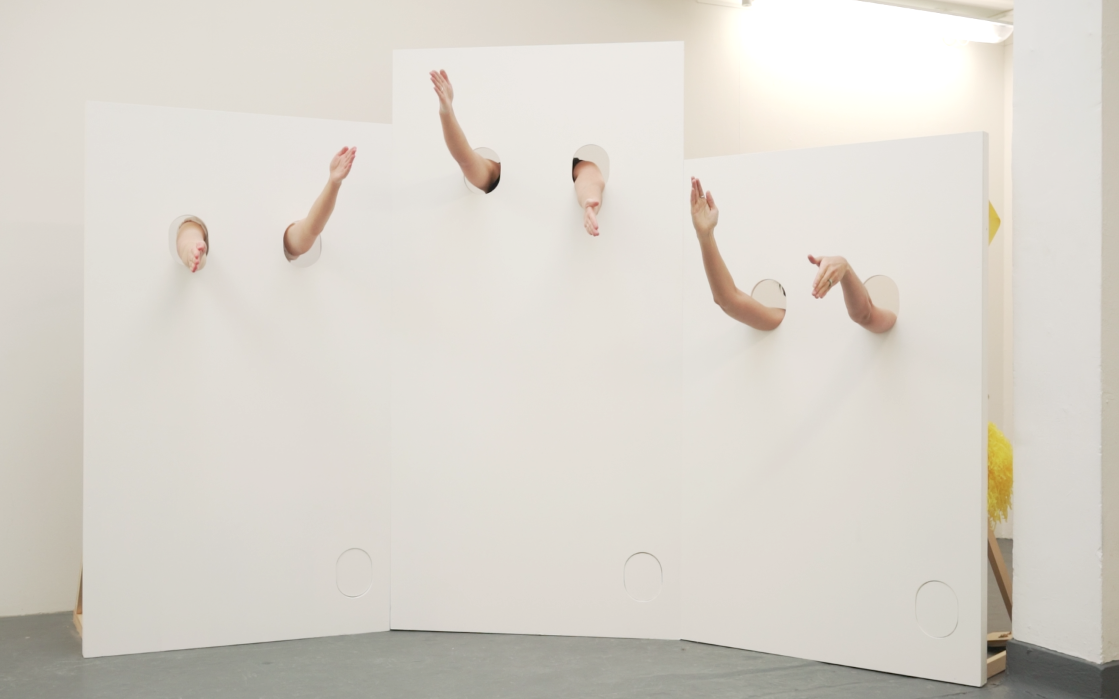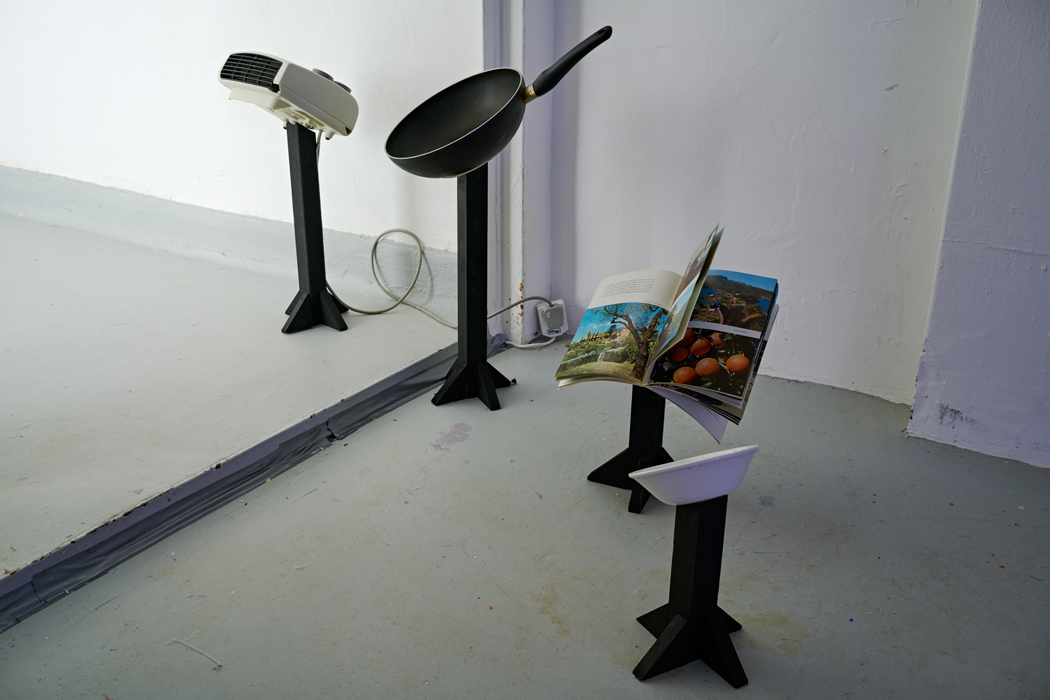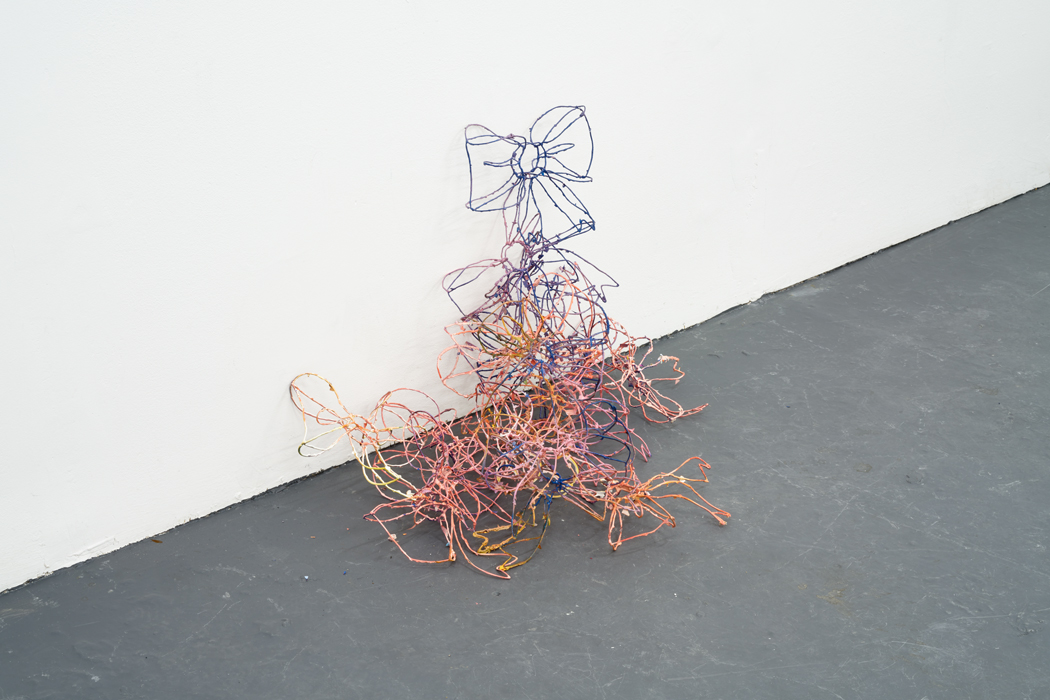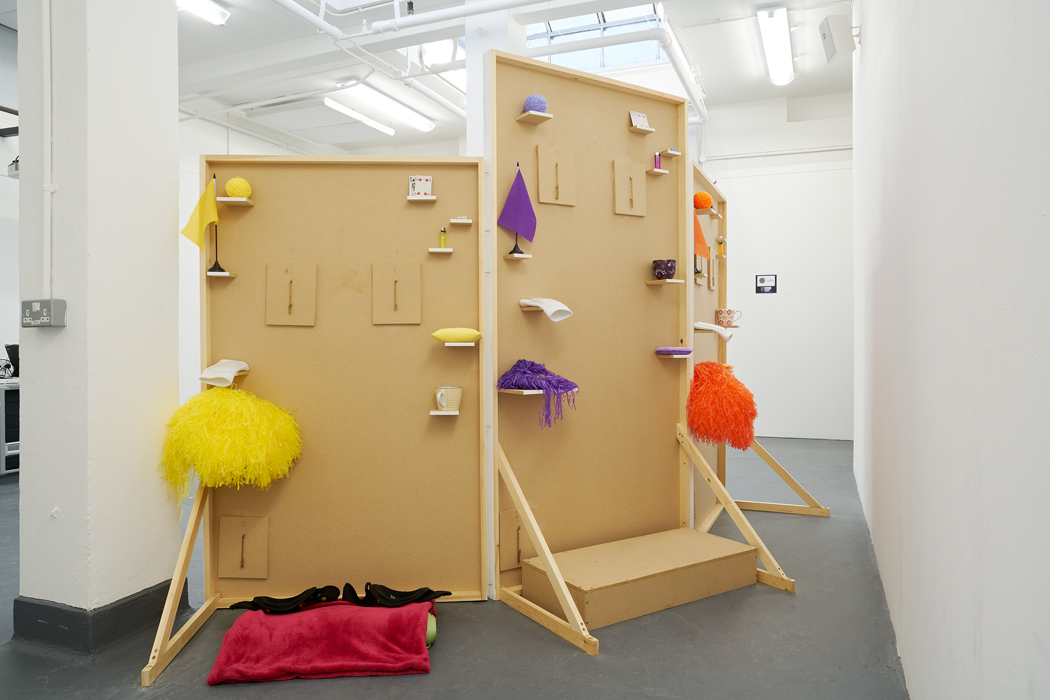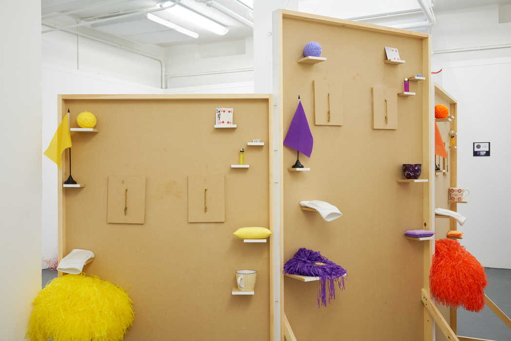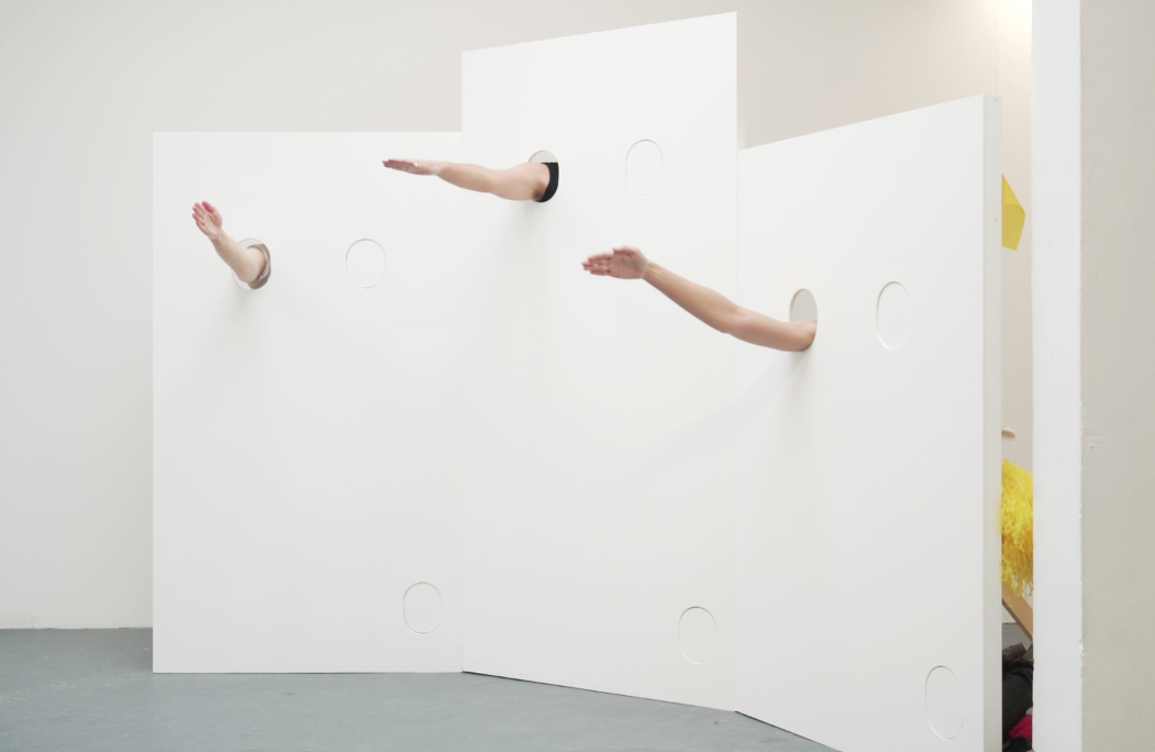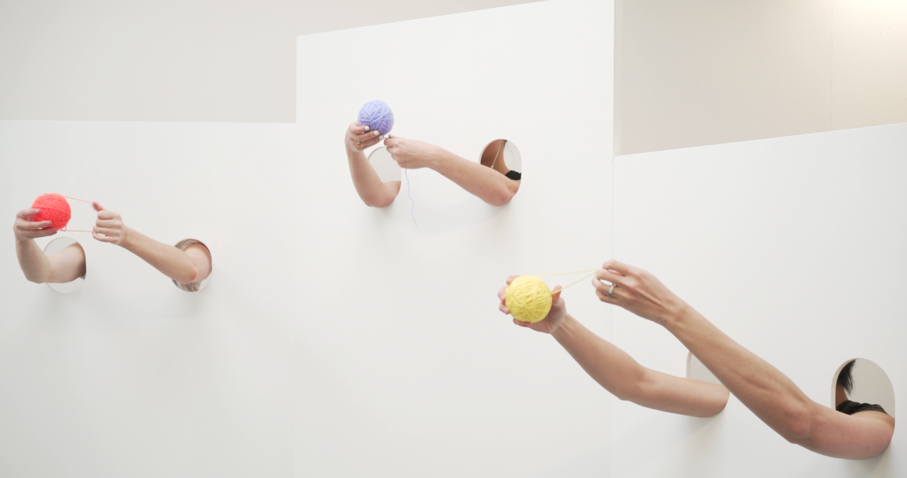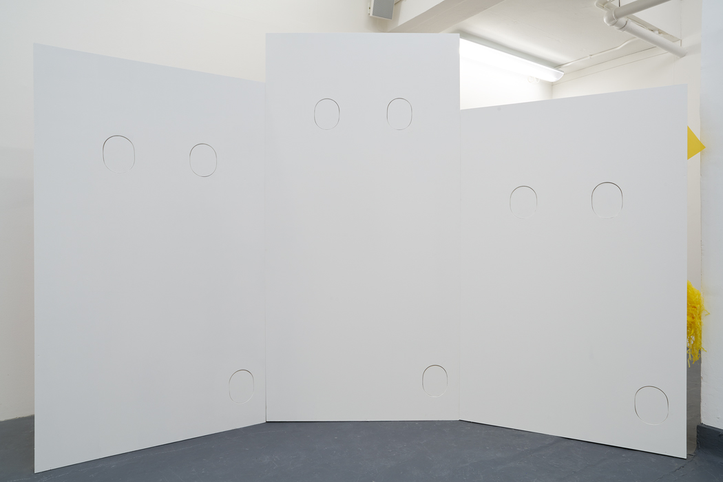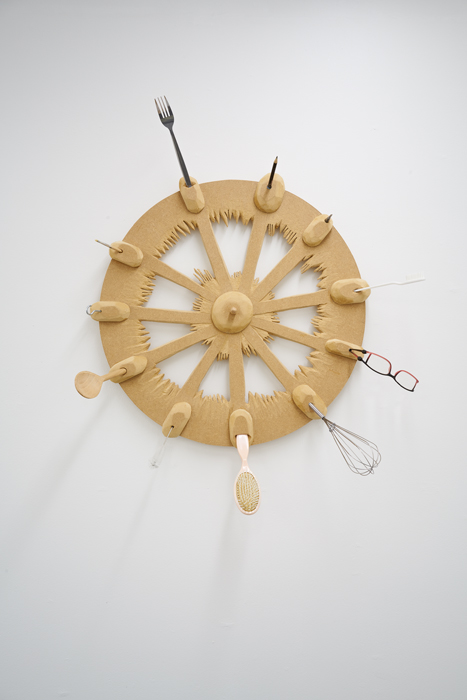 Through objects, gestures, a private wifi broadcast, painting, cutting, song, a screenshot and a roaming laser level line, Weathervane presents an album of scores, salves and scaffolds for the decision-making process. Almost-games, choreographed movements, chance procedures, small gestures and quite a few “bad” decisions speak to the desire to care for the future, to know the right path, to knit oneself into the known.