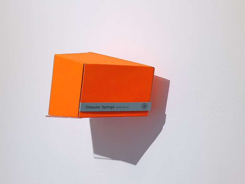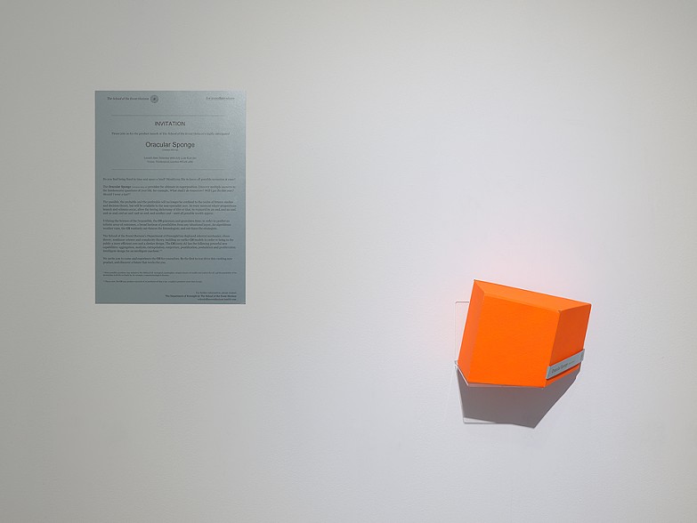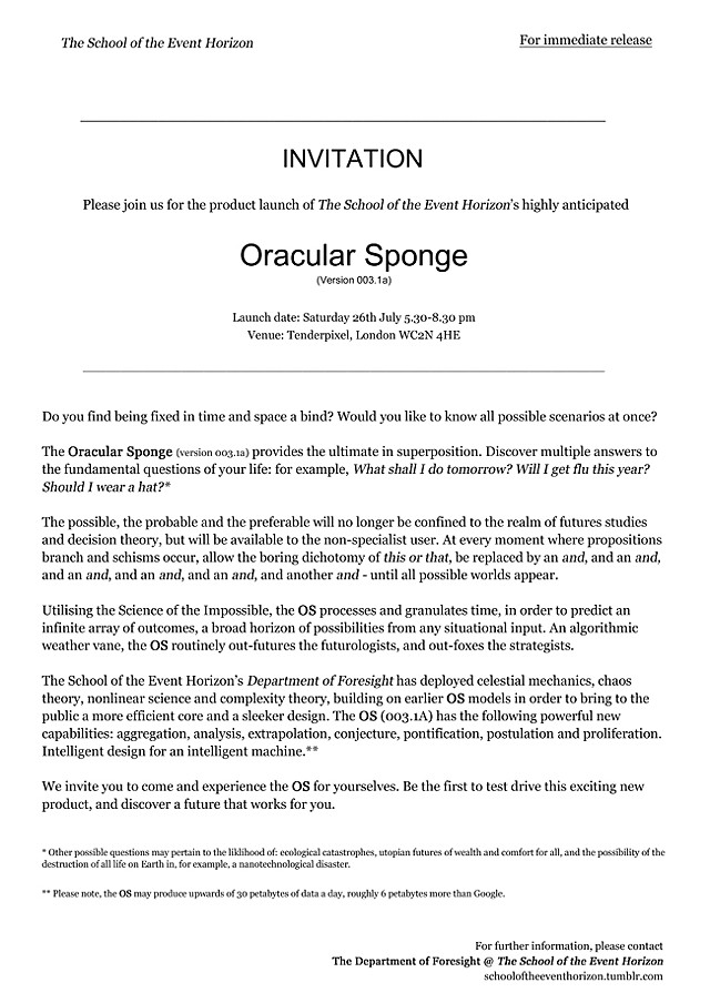 For the exhibition “before breakfast we talked about the furthest visible point before it all disappeared” at Tenderpixel, London, the School of the Event Horizon designed, advertised and launched a fictitious time-granulation device, called the Oracular Sponge (version 003.1a). The gallery displayed a packaging design for the product, alongside a press release advertising its launch. At a closing event, the School gave a product demo, ceremonially unboxing the product (made of thin air), and describing its form and functions using hand gestures.